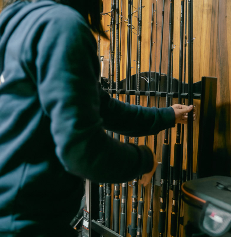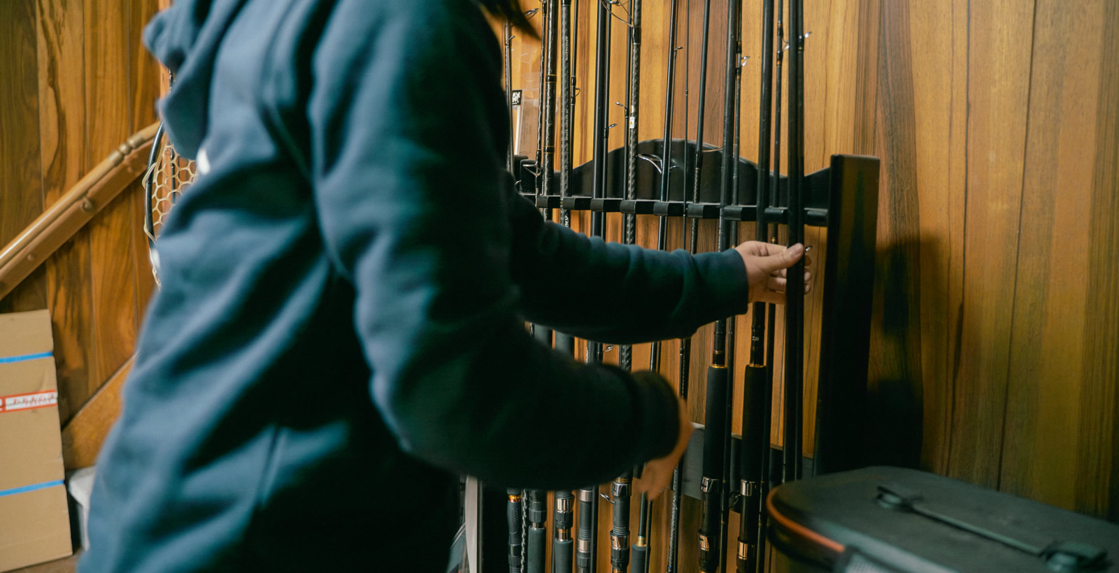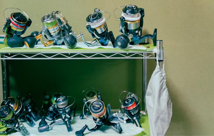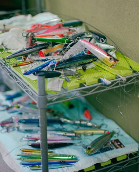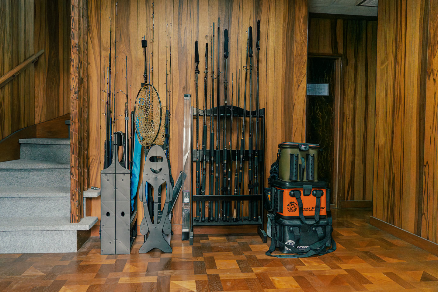 玄関を入ってすぐの場所に竿やタモ、道具を入れるバッグなどが置いてある。また新しい道具も徐々に増えているという