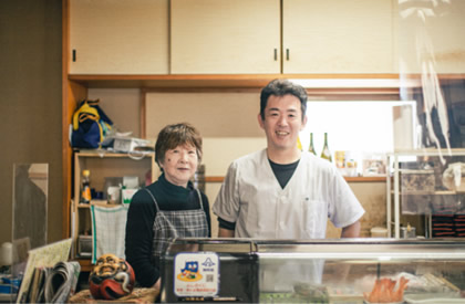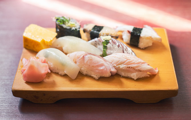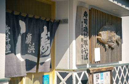 堂ヶ島でバスを降りたところにある、瀬浜寿司でコーディネーターと一緒にお昼を食べます。メインのネタに、自分で毎朝仕入れた地魚を使っているというお寿司をいただきながら、西伊豆についてのあれこれをお教えします。