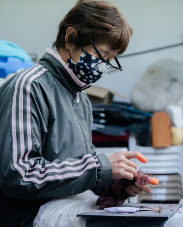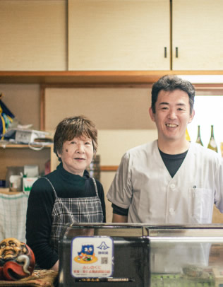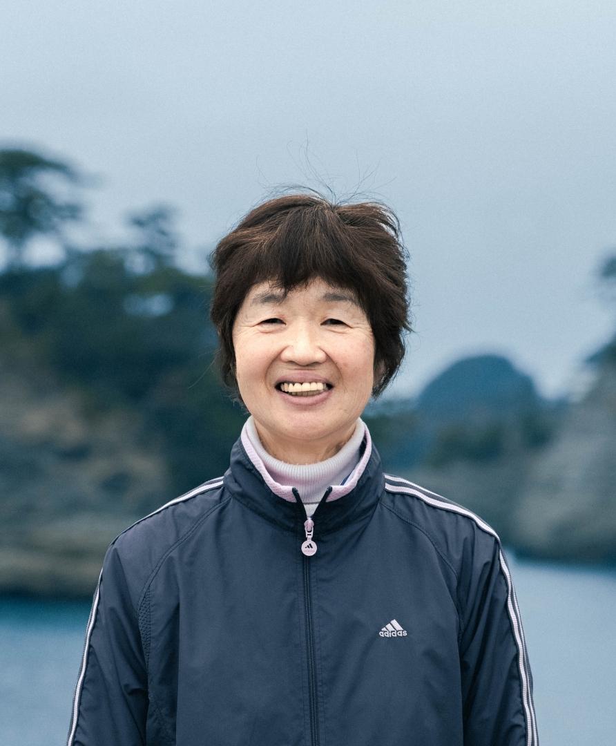 西伊豆町仁科生まれ。青森出身の父と仁科出身の母の長女。高校卒業後、20歳まで東京の伊藤ハムに就職。ご主人の転勤で帰省し子育てをしながら、西伊豆グルメの海賊焼の会社「佐野製麺」に従事。(ちなみに海賊焼の名付け親)。会社員でありながらエビ網を手伝っており、56才で海女に転身。現在5年目。早く先輩達と同じくらい稼ぐのが目標。