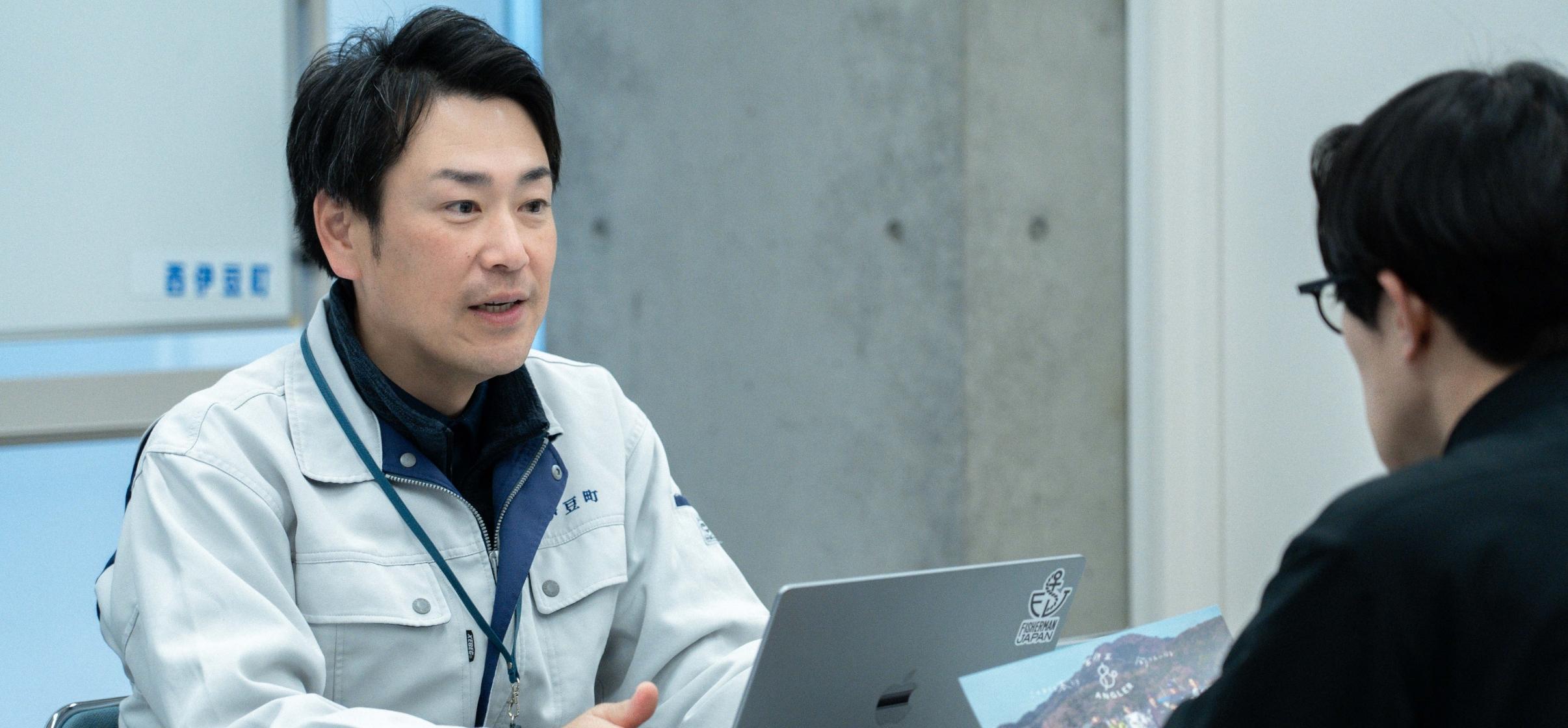 産業建設課農林水産係西伊豆町生まれ、海育ち。役場職員の他、漁師、魚屋と三足のわらじを履く。2004年に入庁し、企画、観光、商工、人事などを経て現在は海業振興を担当。観光地の中心地における産地直売所「はんばた市場」の立ち上げ、電子地域通貨「サンセットコイン」の導入や、「ツッテ西伊豆」の仕組み構築、 「海釣りGO!!」の立ち上げに携わる。小さな町ならではのスピード感を活かし、民間事業者と連携して地域課題解決に取り組んでいる。